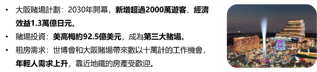 - 賭場2030年大阪落成,美高梅(MGM)投資約92.5億美元 (投資規模最大)