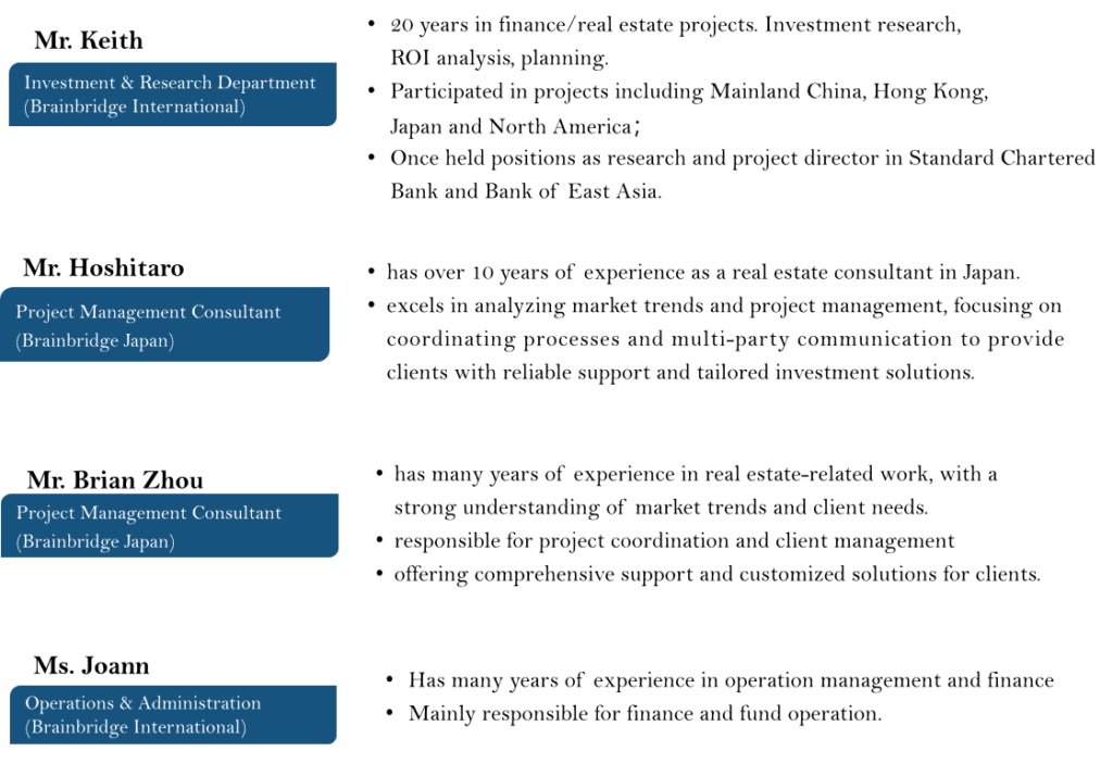 Our team has 20+ years of experience in real estate development and has participated in projects such as office buildings, shopping centers, hotels and serviced apartments in Hong Kong, Shanghai, Southeast Asia and Japan.