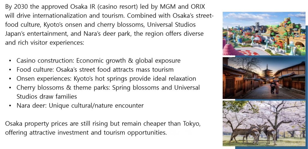 • Bloomberg reports that tourists visiting Japan will double to 60 million in 2030, Osaka’s tourists will increase from 10 million now to 20 million, and real estate prices will rise.